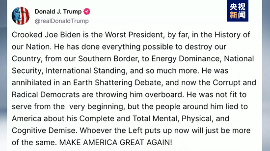 得知拜登退选,特朗普不依不饶。他在社交媒体上发文称,既然拜登无法继续竞选总统,那么“当然也无法担任总统”。特朗普还在接受美国媒体采访时称拜登是“美国史上最差总统”,并表示,打败哈里斯比打败拜登更容易。