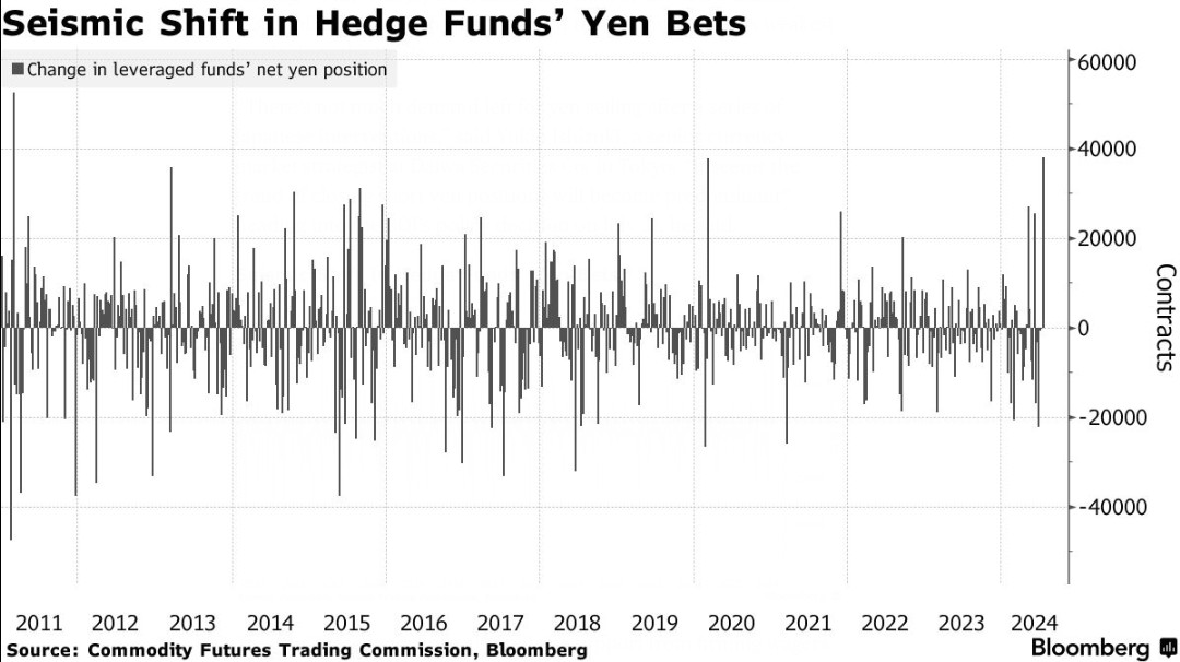 尽管对冲基金仍持看跌态度,净卖出76,588份合约,但这一转变恰逢市场对日元的情绪有所改善。上周,日元兑美元汇率反弹至6月初以来的最高水平。在动荡的交易周中,对冲基金纷纷撤出,据估计,日本在两个交易日内投入了5.64万亿日元(约358亿美元),将日元从1980年代以来的最低水平提振。
